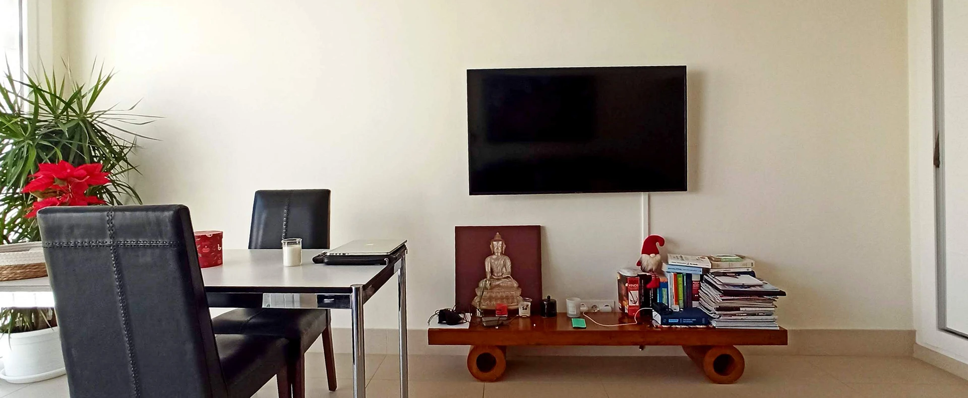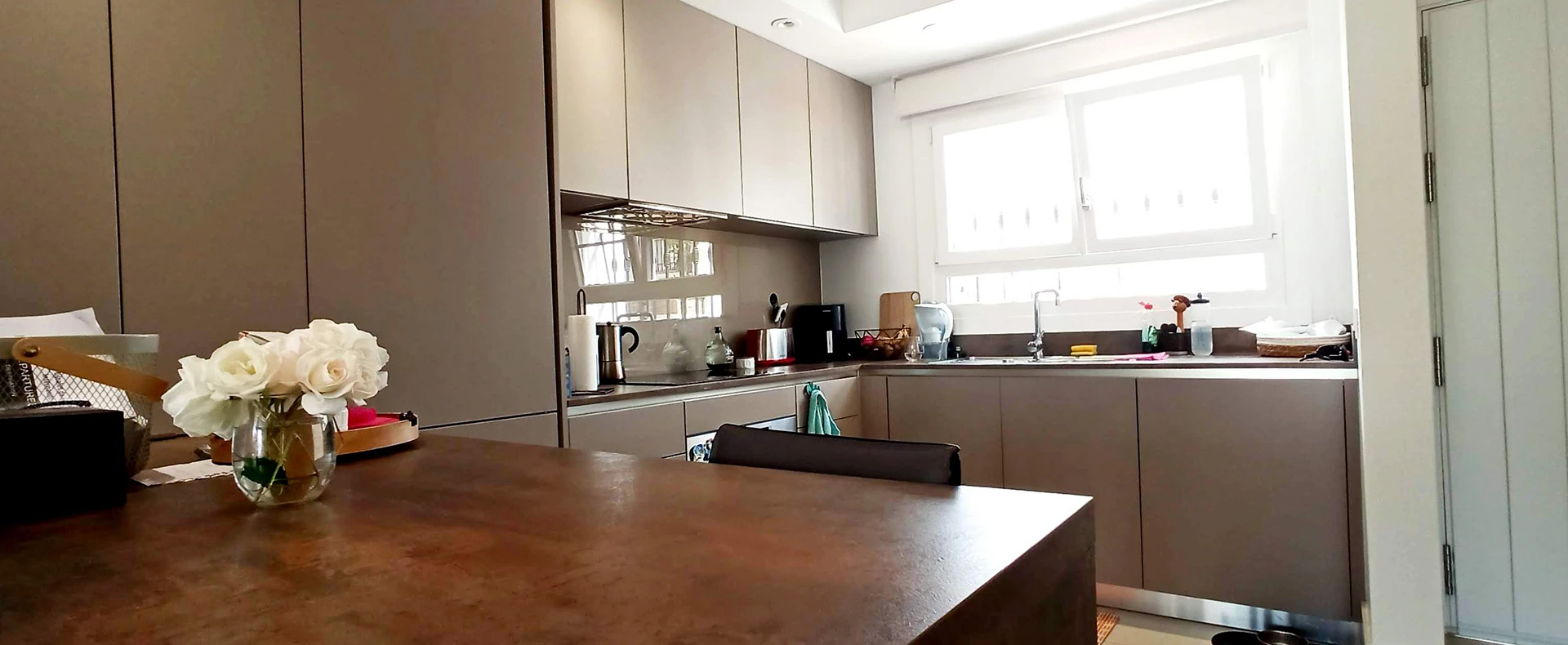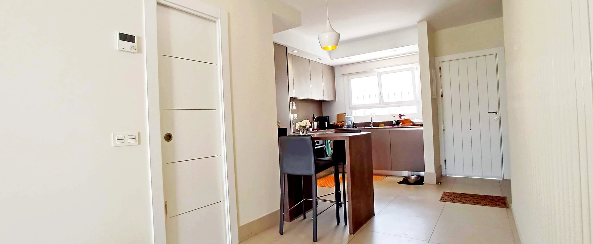 Es handelt sich um ein dreistöckiges Reihenhaus. Im Erdgeschoss befinden sich eine offene Küche von hoher Qualität, ein nach Osten ausgerichtetes Wohnzimmer, eine kleine Terrasse und eine Toilette. Im Obergeschoss befinden sich die beiden Schlafzimmer mit ihren jeweiligen Badezimmern.