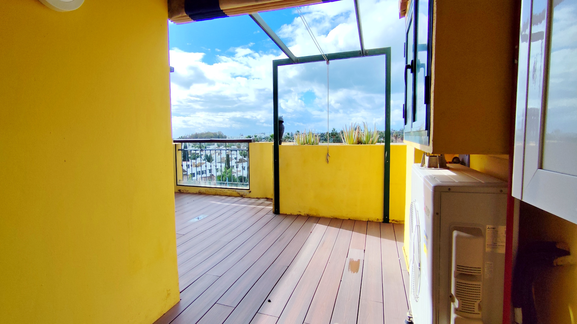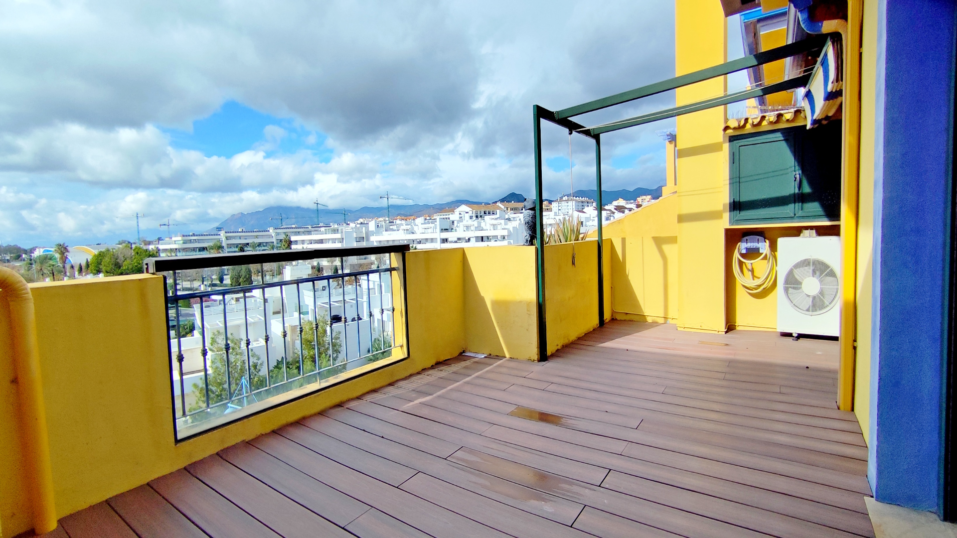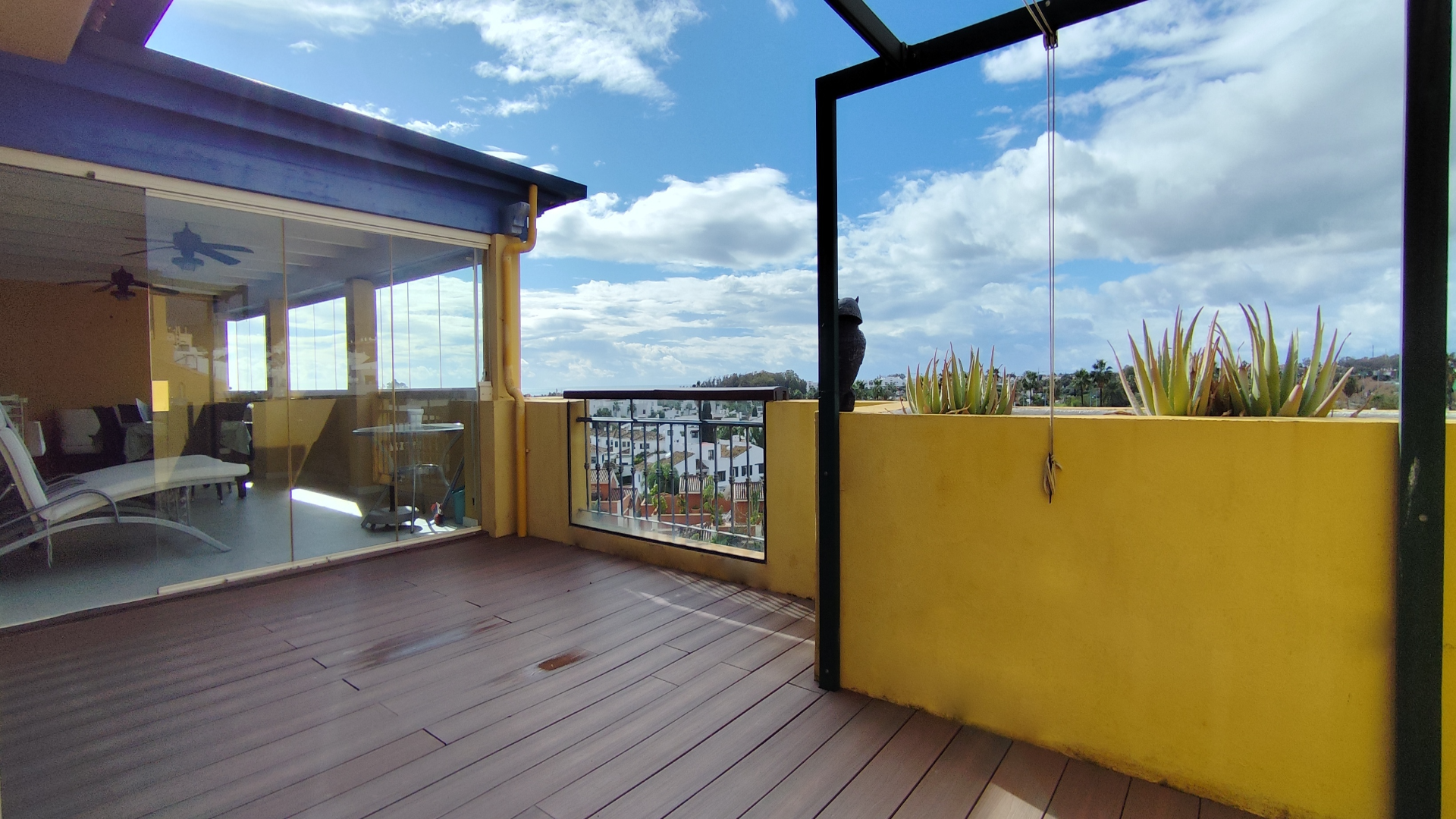 Con 105 m² interiores y 65 m² de terraza, el ático se distribuye en dos dormitorios y dos baños, destacando un luminoso salón con chimenea y salida directa a la terraza. Tanto los dormitorios como la cocina cuentan también con acceso a la terraza, creando una fluidez interior-exterior ideal para disfrutar del clima soleado de la Costa del Sol. Una parte de la terraza está techada y cerrada con cortinas de cristal Lumon, perfecta para usar como salón exterior durante todo el año. Además, dispone de persiana eléctrica en el salón para mayor confort.
